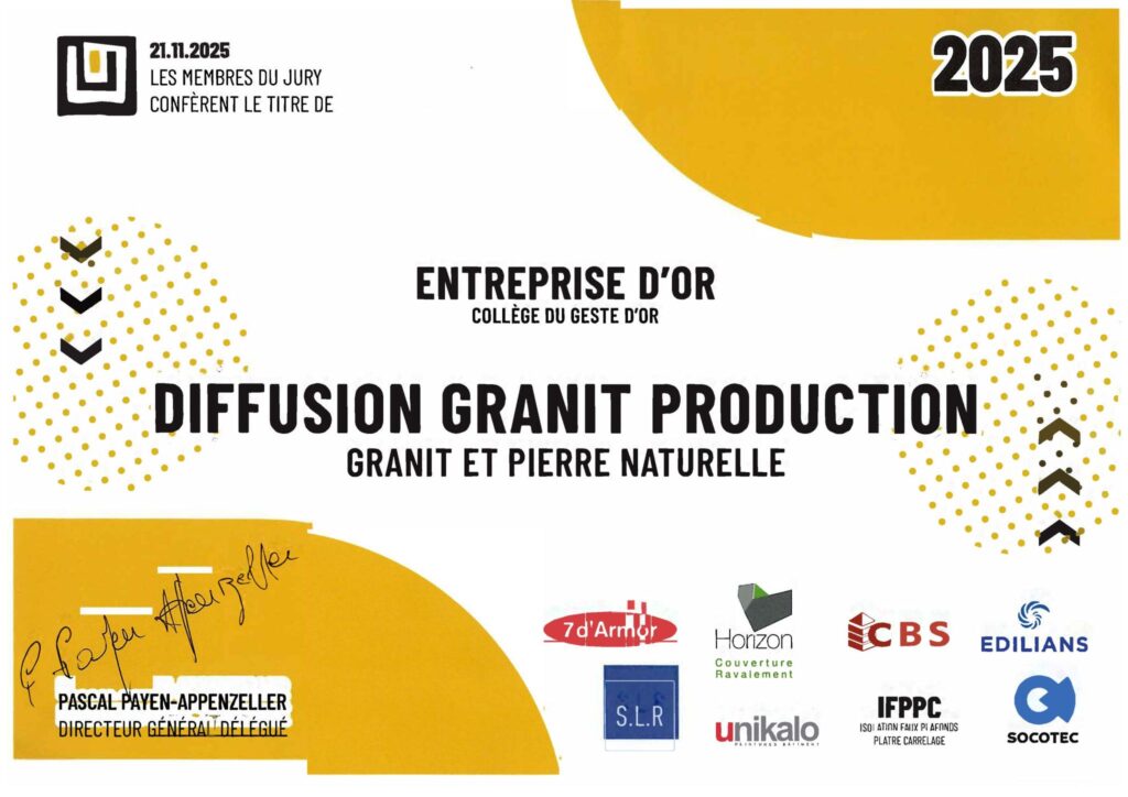Nous sommes fiers d’avoir reçu la distinction du Geste d’Or, récompensant notre savoir-faire artisanal et l’excellence de notre travail de la pierre.